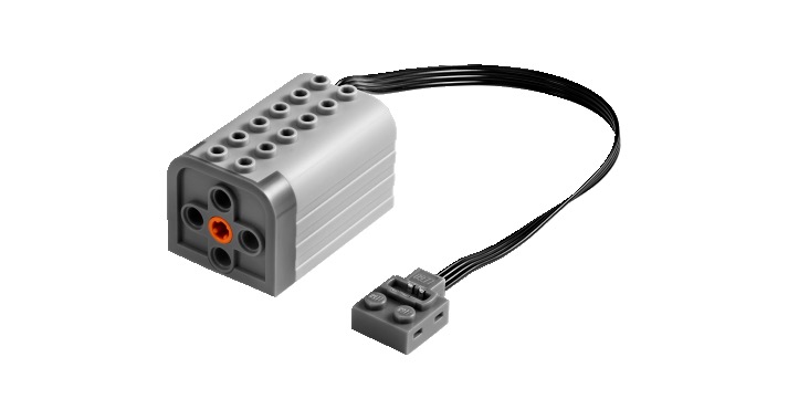 Электродвигатель мощностью 5 В со встроенным редуктором. Передаточное соотношение 9,5:1 обеспечивает максимальный крутящий момент 4,5 и скорость вращения вала до 800 оборотов в минуту без нагрузки. LEGO моторы также может играть роль эффективного генератора.