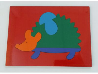 Пособие представляет из себя оклеенную цветной пленкой фанерную "открытку" с изображением, которое свободно вынимается из формы "открытки". В свою очередь, само изображение хитроумно разрезано на различные цветовые геометрические фигуры (пазлы).