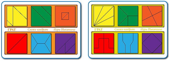 В каждом уровне 12 вариантов квадратов на фанерных планшетах. Складывая квадраты из разноцветных кусочков различной формы, ребенок выполняет несколько видов работ, неодинаковых по содержанию и степени сложности, знакомится с сенсорными эталонами цвета и формы, соотношением целого и части, основами алгоритмизации. Самые младшие начинают понимать, что из частей, иногда даже очень странной формы, можно сложить квадрат. Все детали необходимо перевернуть на лицевую сторону и сообразить, как из кусочков одного цвета сложить квадрат.