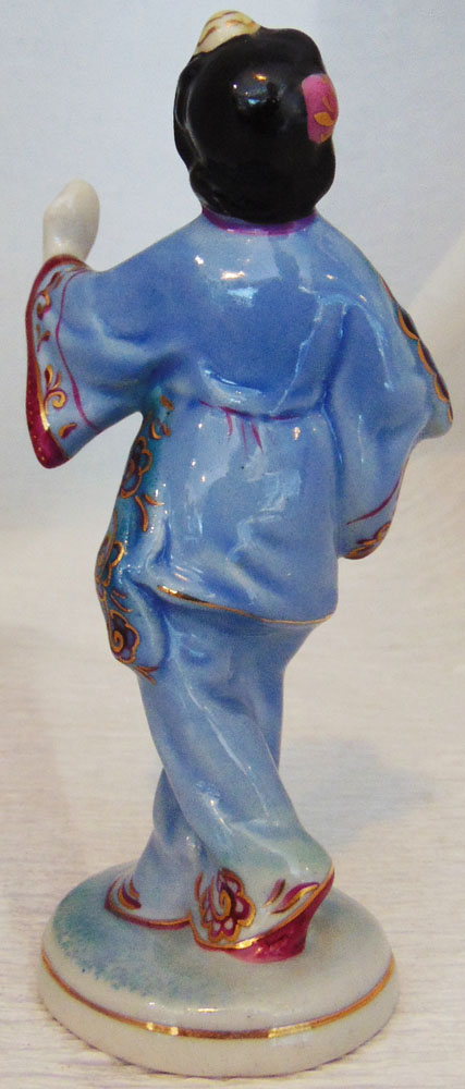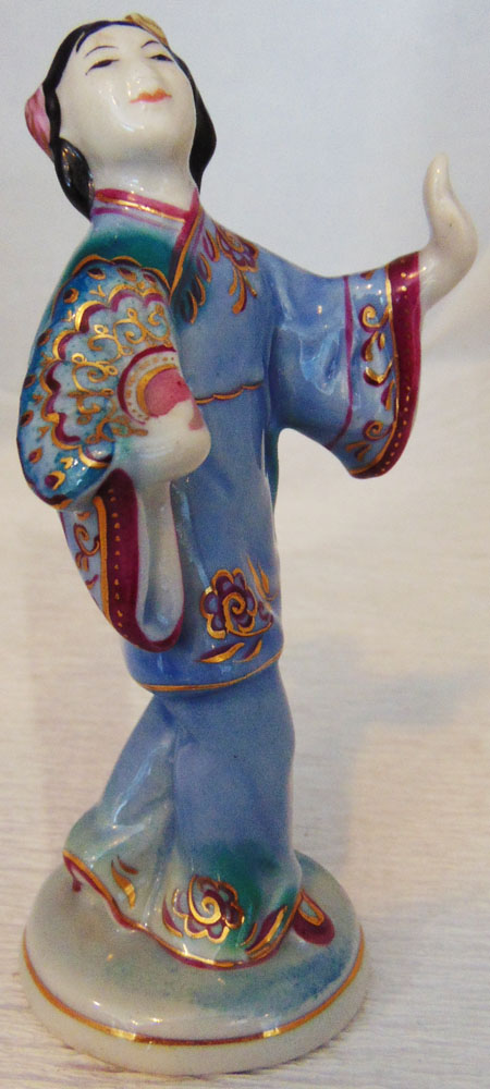Статуэтка Китаянка с веером. Высота 9 см. Производитель: Гжельский фарфоровый завод. Клеймо зеленое ХК (артель "Художественная керамика"), 1950-1960 гг., красное 1 с.
