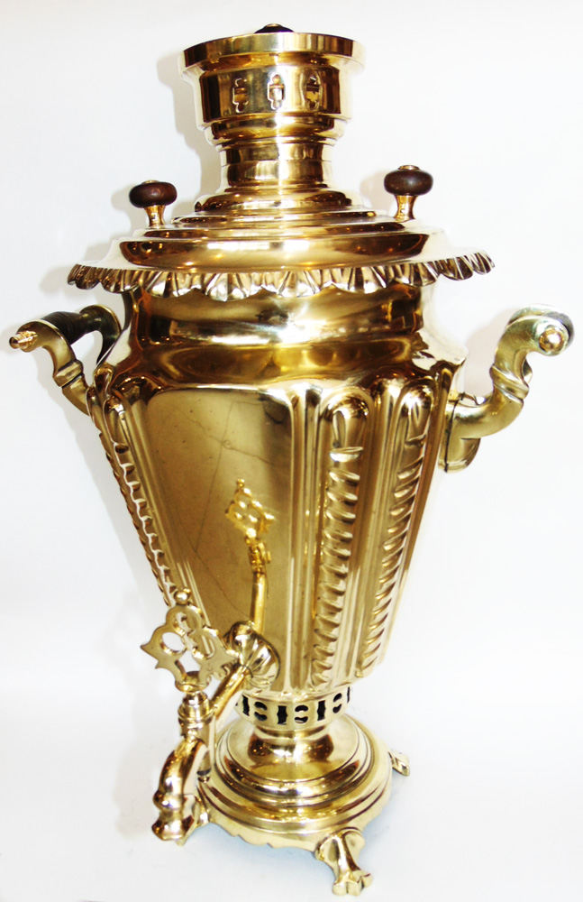 Самовар в форме "рюмка с витыми колоннами". Материал: полированная латунь. Объем: 5 литров. Страна: