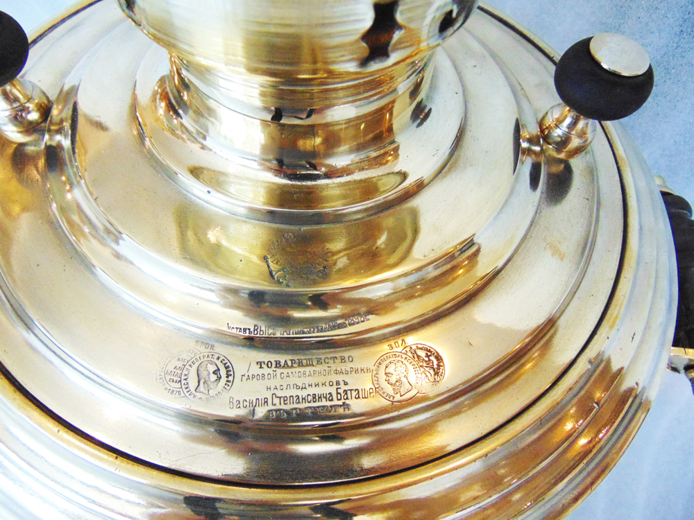 Самовар в форме "гладкая рюмка". Материал: полированная латунь. Объем: 4,5 литра. Страна: Российская империя, г. Тула. Производитель Баташев Василий Степанович, наследники. Период работы фабрики: 1896-1918 гг. На крышке клеймо "Товарищество Паровой Самоварной Фабрики Наследников Василия Степановича Баташева в Туле", по сторонам четыре оттиска двух медалей выставок.