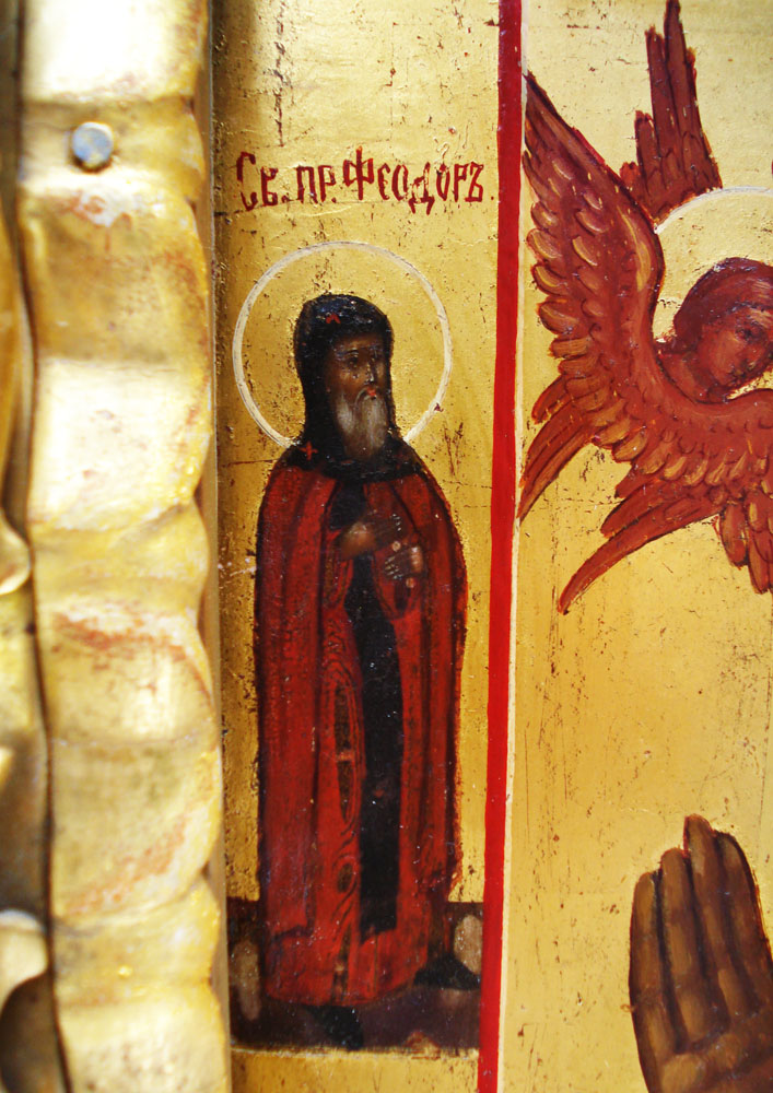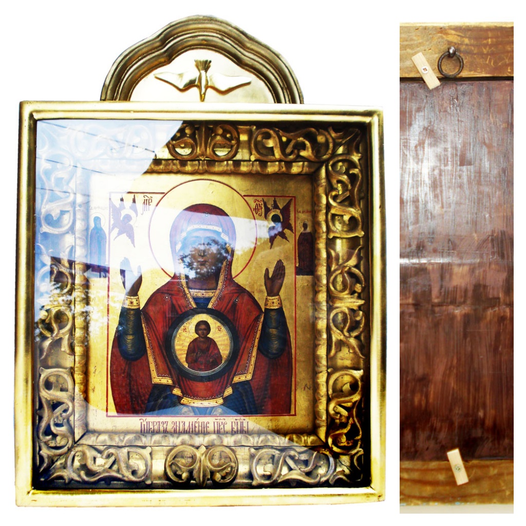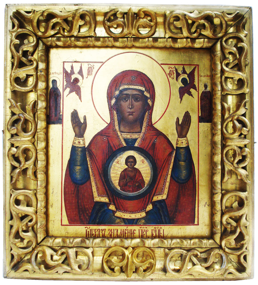 Божией Матери "Знамение" с предстоящими Федором и Анисьей. Дерево, левкас, темпера, сусальное золото. Киот: дерево, гипс, позолота, краска. Размер 28 х 33 см.