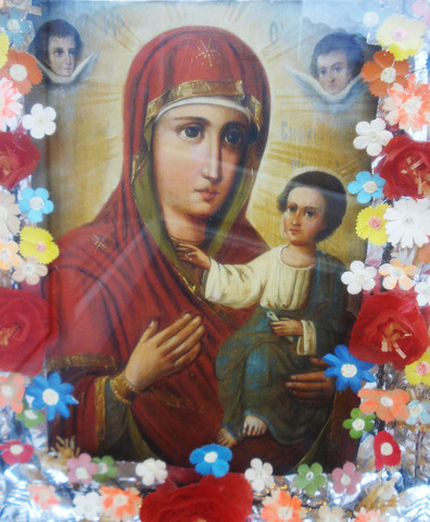 Икона Божией Матери "Праворучица". Икона: дерево, масляные краски; размер 21 х 26 см. Киот: дерево, краска, фольга, текстиль, стекло; размер 41 х 50 см. Российская империя (Кубань), конец 19 - начало 20 века. Киот закрыт наглухо, поэтому икона сфотографирована через стекло.