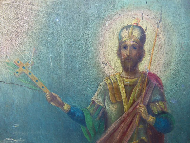 Изображение святого в полный рост. Иоанн воин в воинском облачении, в правой руке держит крест, в левой руке – копье.