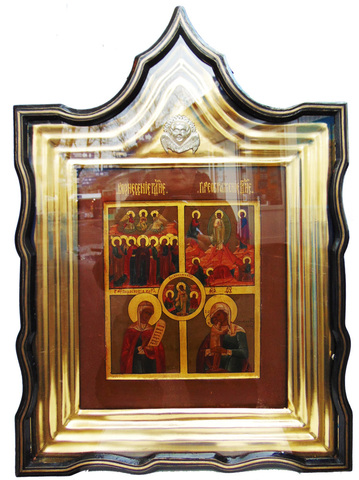 Икона Избранные праздники (Воскресение, Преображение, Вознесение Господне, святая Параскева, Взыскание погибших). Икона: дерево, левкас, темпера. Размер: 31 х 35 х 3,2 см. Киот: дерево, левкас, масляные краски, позолота, стекло.