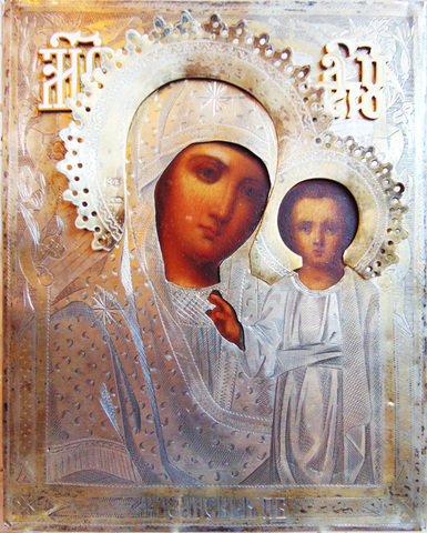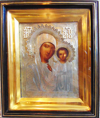 Икона Божией Матери Казанская. Материалы. Икона: дерево, левкас, темпера. Оклад: серебро проба 84, штихельная гравировка, эмаль. Киот: дерево, масляные краски, сусальное золото, стекло. Размер: икона и оклад 14х17, киот 21х24 см. На венцах клеймо с указание пробы "84" и именник мастера "А.М." На нижнем ребре оклада клеймо пробиного мастера "В.С. 1878", проба серебра "84", герб Москвы и клеймо серебряных дел мастера "А.М."