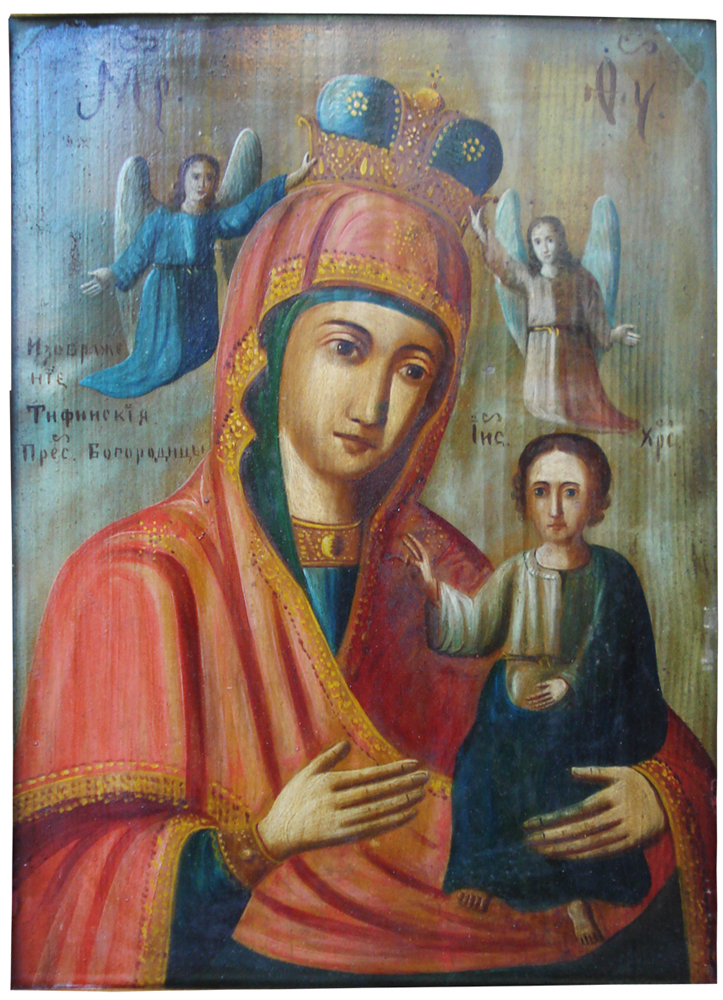 Тихвинская икона Божией Матери. Размер: икона 21х25, киот 40х44 см. Материалы. Икона: дерево, масляные краски; киот: дерево, масляные краски. Конец 19-начало 20 в.