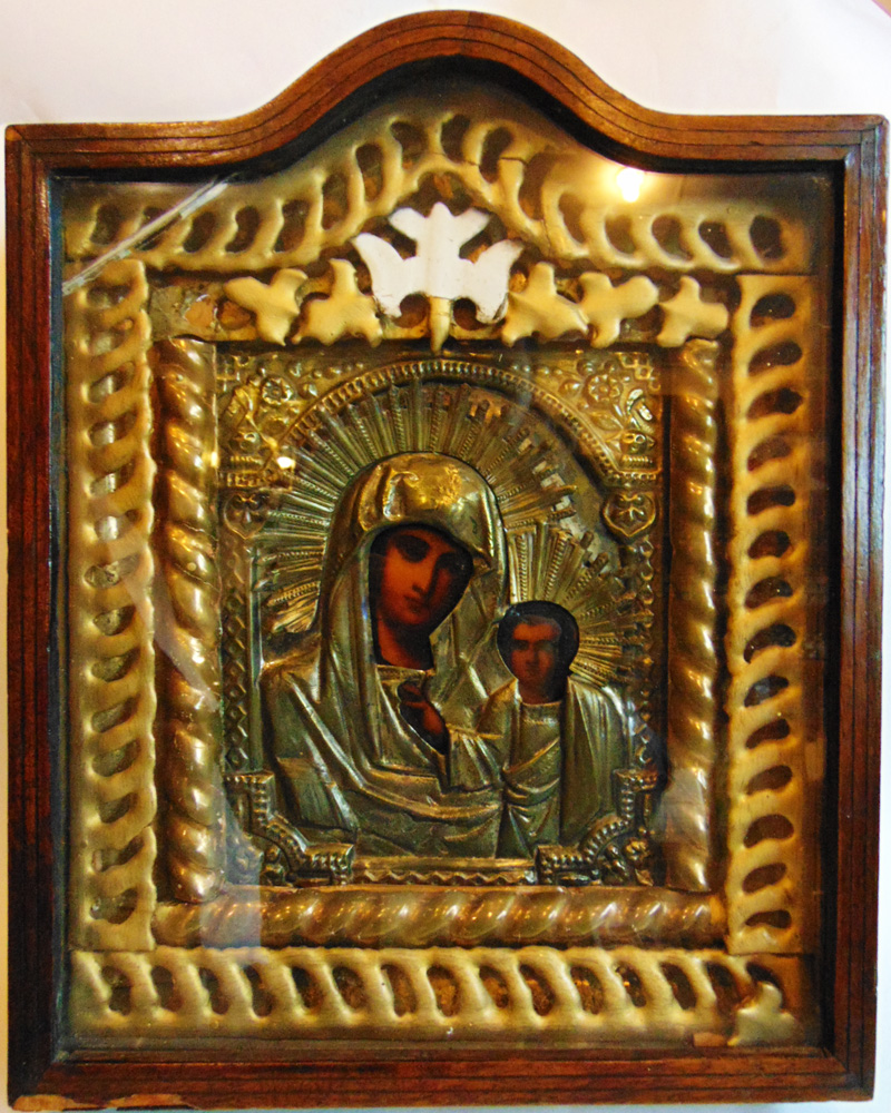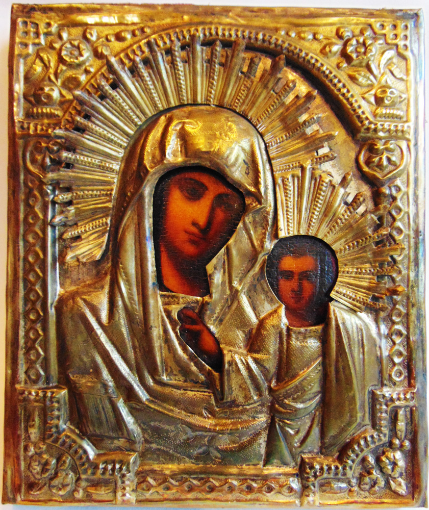 Казанская икона Божией Матери. Икона: размер 22х26 см; дерево, левкас, темпера. Живопись подокладная. Оклад латунный. Киот: размер: 35х44 см; дерево, масляные краски, гипс. Роосийская империя, конец 19 - начало 20 века.