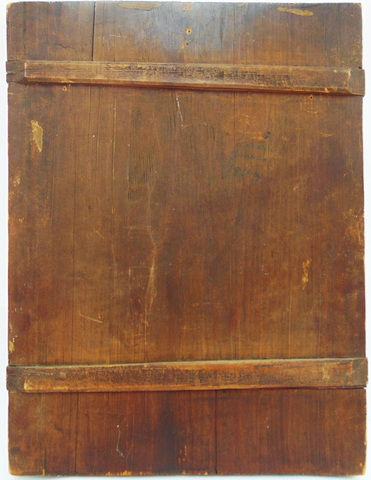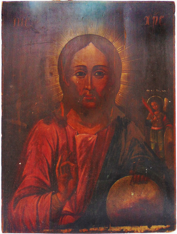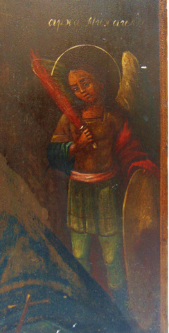 Икона Господь Вседержитель с предстоящим св. Михаилом. Дерево, врезные шпонки, левкас, темпера. Размер 60х50х2,5 см. Российская империя, 1861 г. (на обороте надпись чернилами "… написал 1861 год").