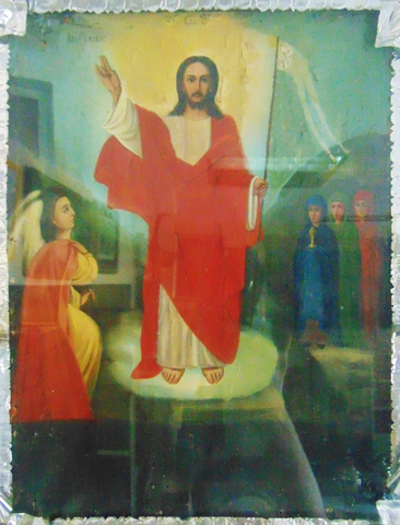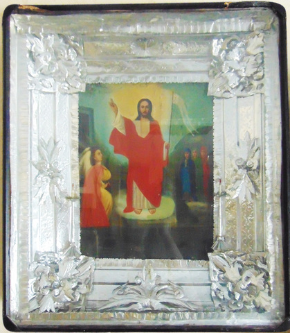 Икона Воскресение Христово. Материалы: икона: дерево, масляные краски; киот: дерево, масляные краски, стекло, фольга. Размер: икона около 30х39 см, киот 59х68 см. Российская империя, Кубань. Конец 19-начало 20 в.