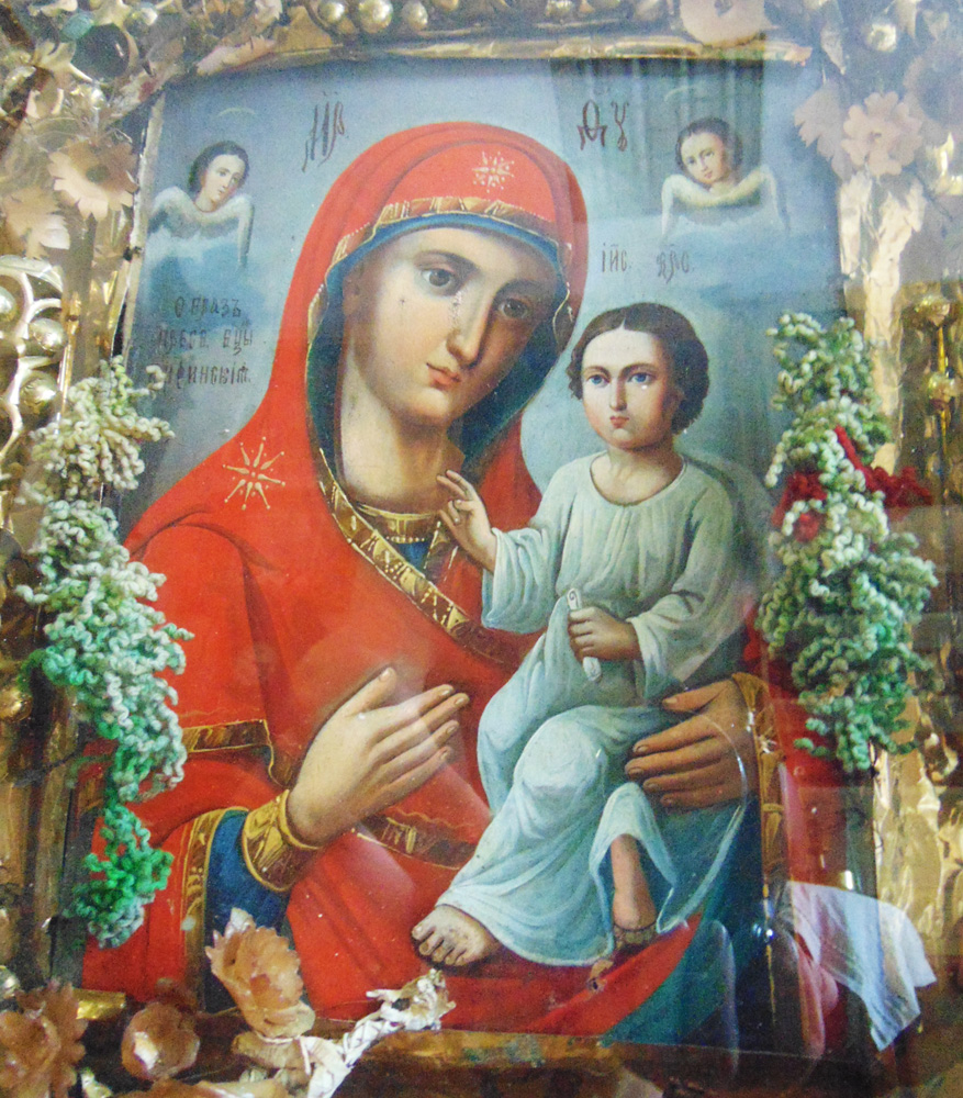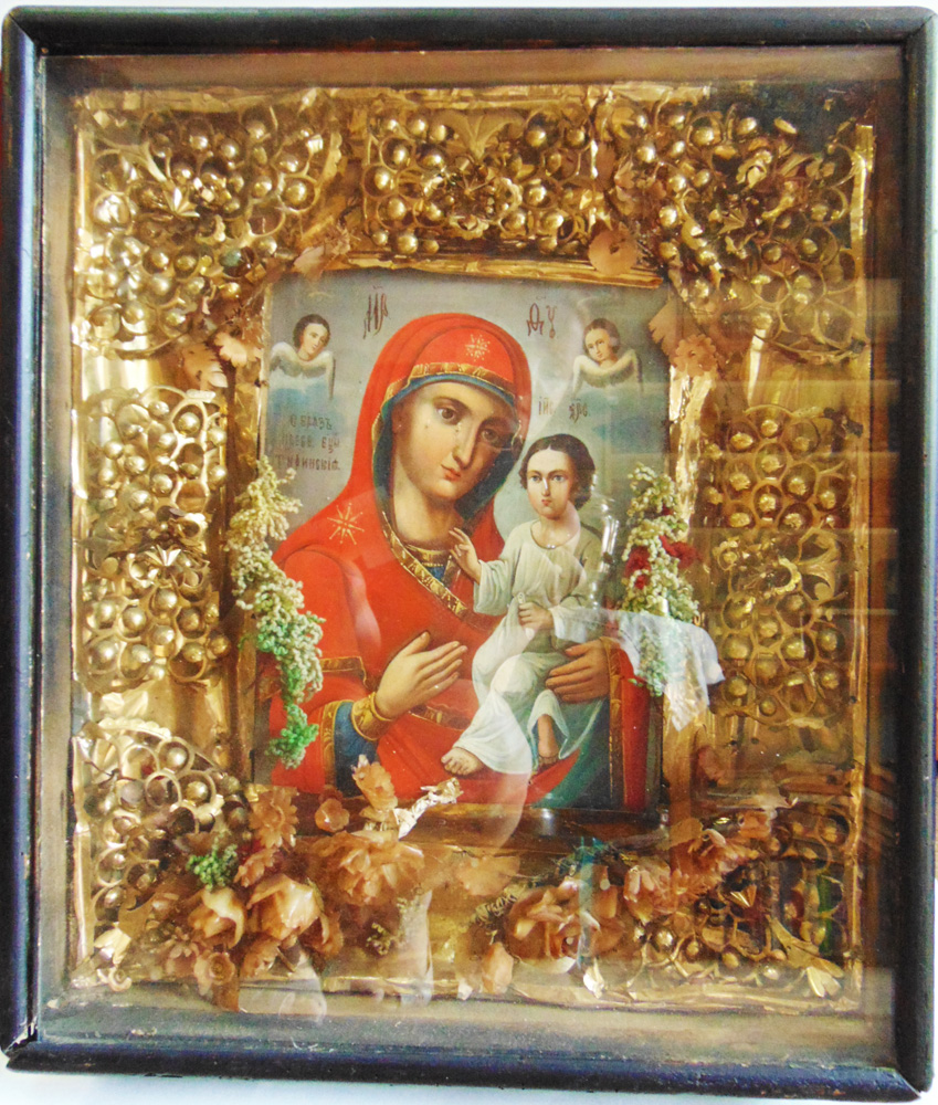 Тихвинская икона Божией Матери. Размер: икона 23х30, киот 46х53 см. Материалы. Икона: дерево, масляные краски; киот: дерево, масляные краски, стекло, фольга, текстиль. Российская империя, Кубань. Конец 19-начало 20 в.