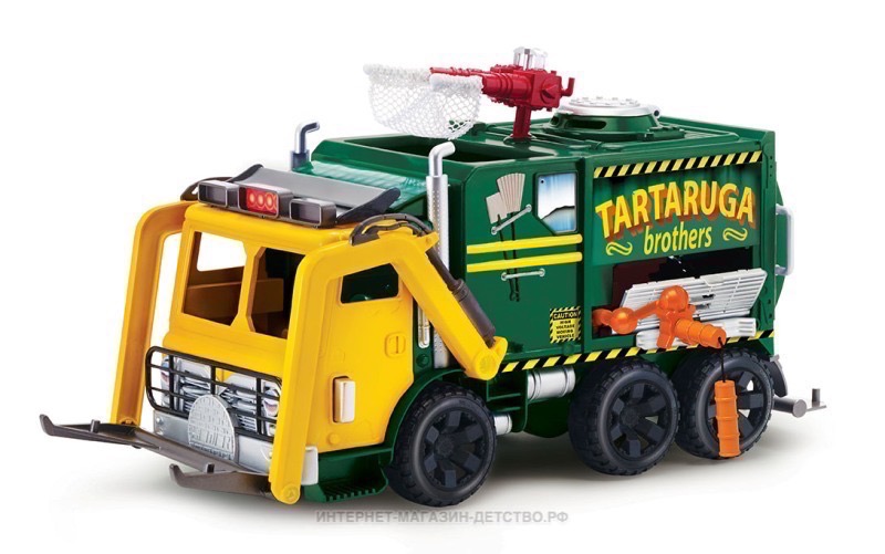 Мусоровоз был переоборудован в боевую машину Черепашек. Множество функций: ловчая сеть, выстреливается из ракетной установки; за решеткой радиатора замаскирована установка по стрельбе дисками-звездачкаи; сбоку встроены боевые нунчаки, которые активизируются при езде (раскручиваются). Множество вариантов размещений черепашек в машине. Совместима с любыми героями Черепашек-ниндя 12 см.