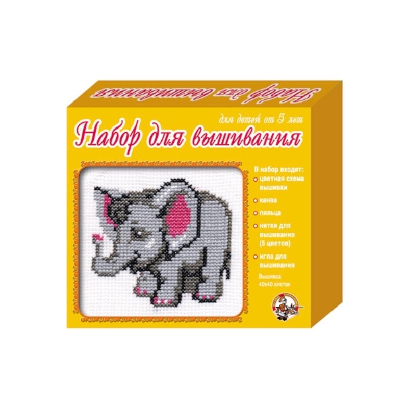 Артикул: 00336; Наименование: Набор для творчества. Вышивка "Слоненок" (с пяльцами); Штрихкод EAN-13: 4606088003368; Штрихкод EAN-14: 14606088003365; Количество штук в коробке: 14; Длина товара (см): 20,5; Ширина товара (см): 17,6; Пол: девочки; Возраст: от 5 лет до 7 лет; Вес нетто, кг: 0,11; Сертификат: RU C-RU. ЛТ47.B.04263 №0629877; срок действия: 29.05.2021; Описание товаров: В набор для вышивания крестиком с пяльцами и иглой «Слоненок» входят: