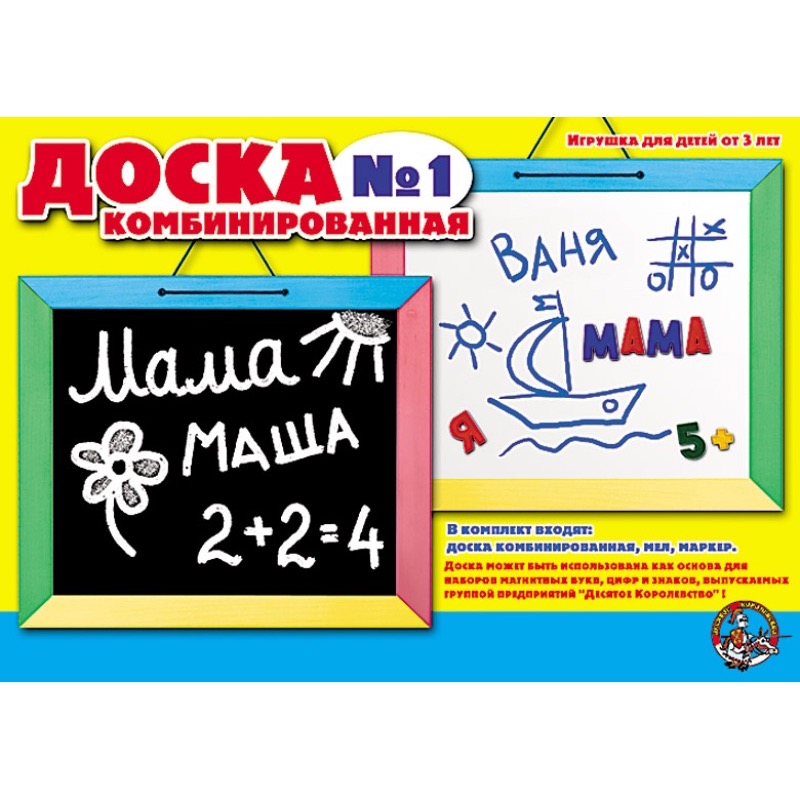 Артикул: 00893; Наименование: Доска комбинированная №1, настенная цв.; Штрихкод EAN-13: 4606088008936; Штрихкод EAN-14: 14606088008933; Количество штук в коробке: 8; Длина товара (см): 40,5; Ширина товара (см): 45,9; Пол: мальчики и девочки; Возраст: от 5 лет до 7 лет; Вес нетто, кг: 1,12; Сертификат: RU C-RU. HA82.B.00075/19 №0107863; срок действия: 28.11.2022; Описание товаров: Первая, из выпущенных нашей компанией, магнитная доска с яркой разноцветной рамкой, окрашенной в сочные цвета радуги. Лицевая поверхность выполнена из лакированной жести, на которой можно рисовать маркером на водной основе, противоположная сторона предназначена для рисования мелом. Протирать обе стороны рекомендуется влажной салфеткой. Это один из самых экономичных вариантов в этой серии.