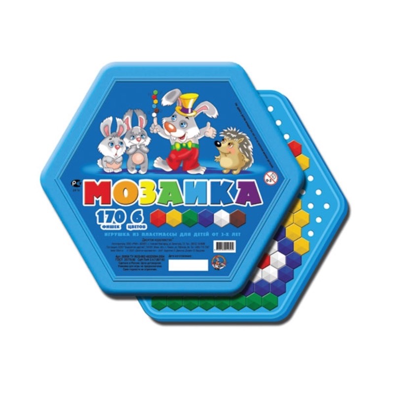 Артикул: 00958; Наименование: Мозаика шестигранная 170 эл; Штрихкод EAN-13: 4606088009582; Штрихкод EAN-14: 14606088009589; Количество штук в коробке: 16; Длина товара (см): 20; Ширина товара (см): 22,5; Пол: мальчики и девочки; Возраст: от 3-х лет до 5 лет; Вес нетто, кг: 0,29; Сертификат: RU C-RU. HA82.B.00074/19 №0107862; срок действия: 28.11.2022; Описание товаров: Мозаика пластмассовая 170 элементов с шестигранным полем в пластиковой упаковке: