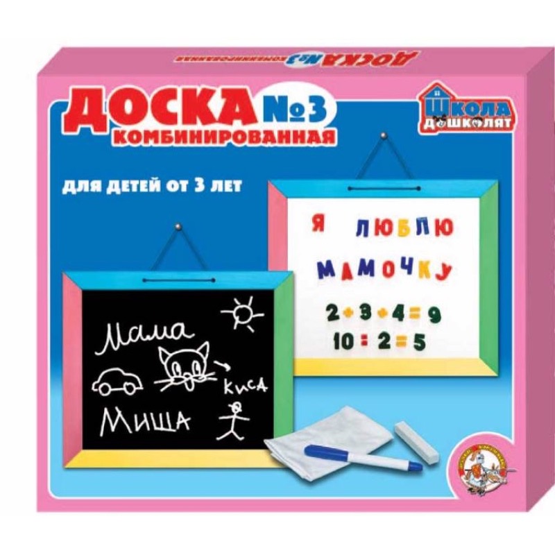 Артикул: 00996; Наименование: Доска комбинированная №3, настенная (рус.алф, цифры, знаки, h35 мм) цв.; Штрихкод EAN-13: 4606088009964; Штрихкод EAN-14: 14606088009961; Количество штук в коробке: 5; Длина товара (см): 47; Ширина товара (см): 41,9; Пол: мальчики и девочки; Возраст: от 5 лет до 7 лет; Вес нетто, кг: 1,64; Сертификат: RU C-RU. HA82.B.00075/19 №0107863; срок действия: 28.11.2022; Описание товаров: По сравнению с доской №1 в состав магнитной доски для детей №3, кроме стандартного набора (маркер, мел, салфетка), включены магнитные наборы русских букв, цифр и знаков высотой 3,5 сантиметра.