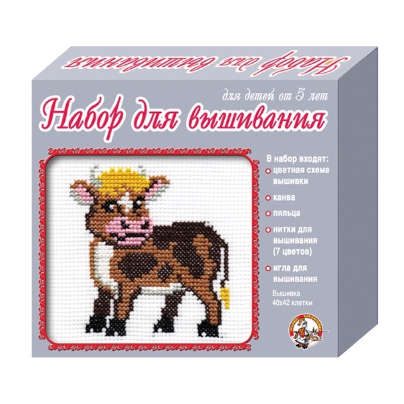 Артикул: 01016; Наименование: Набор для творчества. Вышивка "Бычок" (с пяльцами); Штрихкод EAN-13: 4606088010168; Штрихкод EAN-14: 14606088010165; Количество штук в коробке: 14; Длина товара (см): 20,5; Ширина товара (см): 17,6; Пол: мальчики и девочки; Возраст: от 5 лет до 7 лет; Вес нетто, кг: 0,11; Сертификат: RU C-RU. ЛТ47.B.04263 №0629877; срок действия: 29.05.2021; Описание товаров: В набор для вышивания крестиком с пяльцами и иглой «Бычок» входят:
