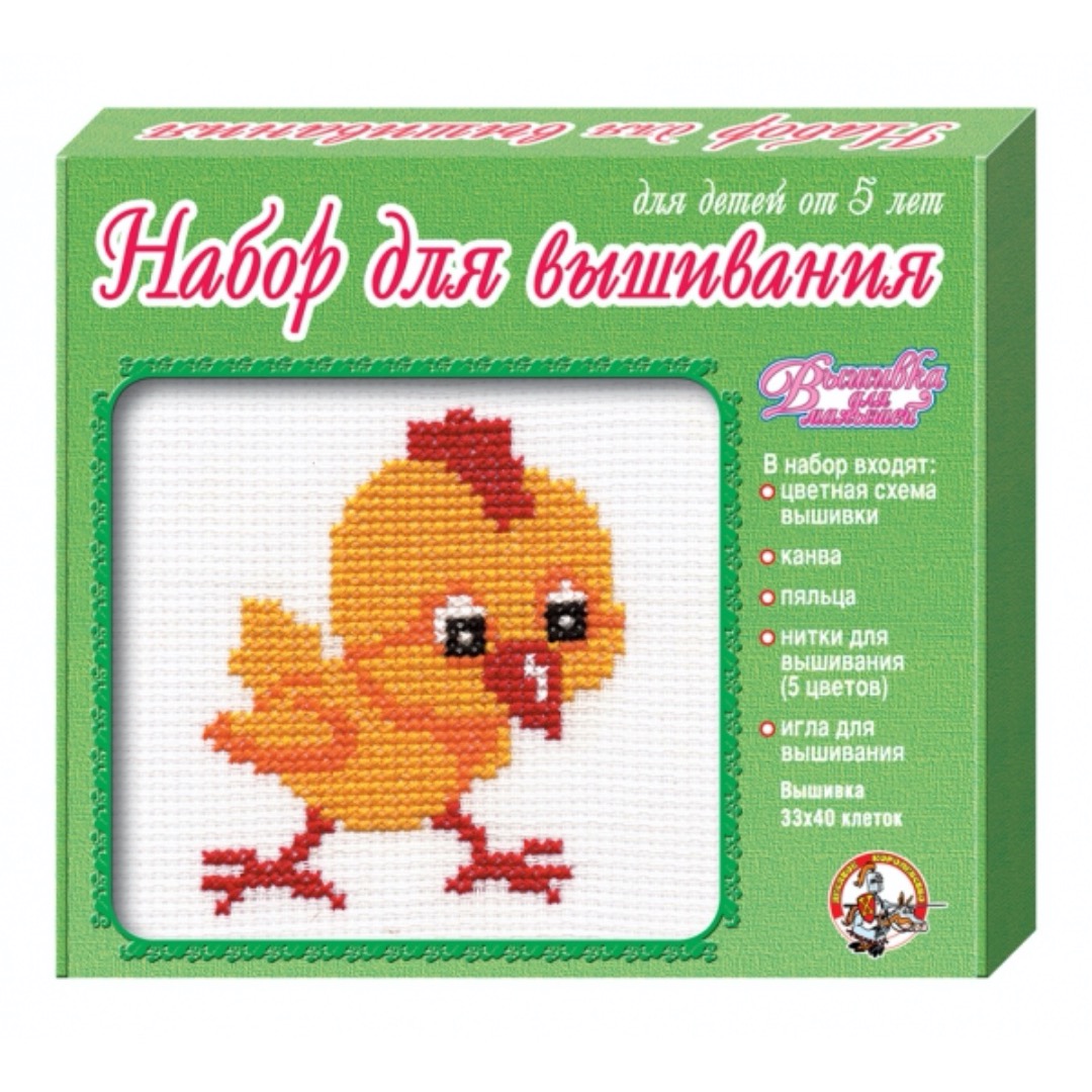 Артикул: 01099; Наименование: Набор для творчества. Вышивка "Цыпленок" (с пяльцами); Штрихкод EAN-13: 4606088010991; Штрихкод EAN-14: 14606088010998; Количество штук в коробке: 14; Длина товара (см): 20,5; Ширина товара (см): 17,6; Пол: мальчики и девочки; Возраст: от 5 лет до 7 лет; Вес нетто, кг: 0,11; Сертификат: RU C-RU. ЛТ47.B.04263 №0629877; срок действия: 29.05.2021; Описание товаров: В набор для вышивания крестиком с пяльцами и иглой «Цыпленок» входят: