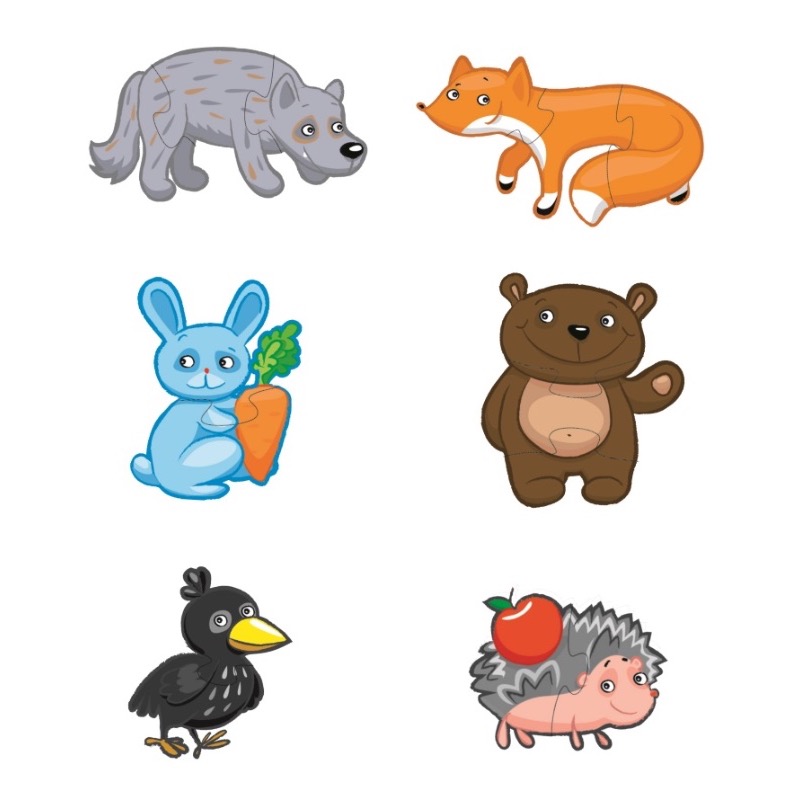 Набор пазлов «Лесные животные» состоит из шести фигурок: волк, лиса, медведь, ежик, ворон и заяц.