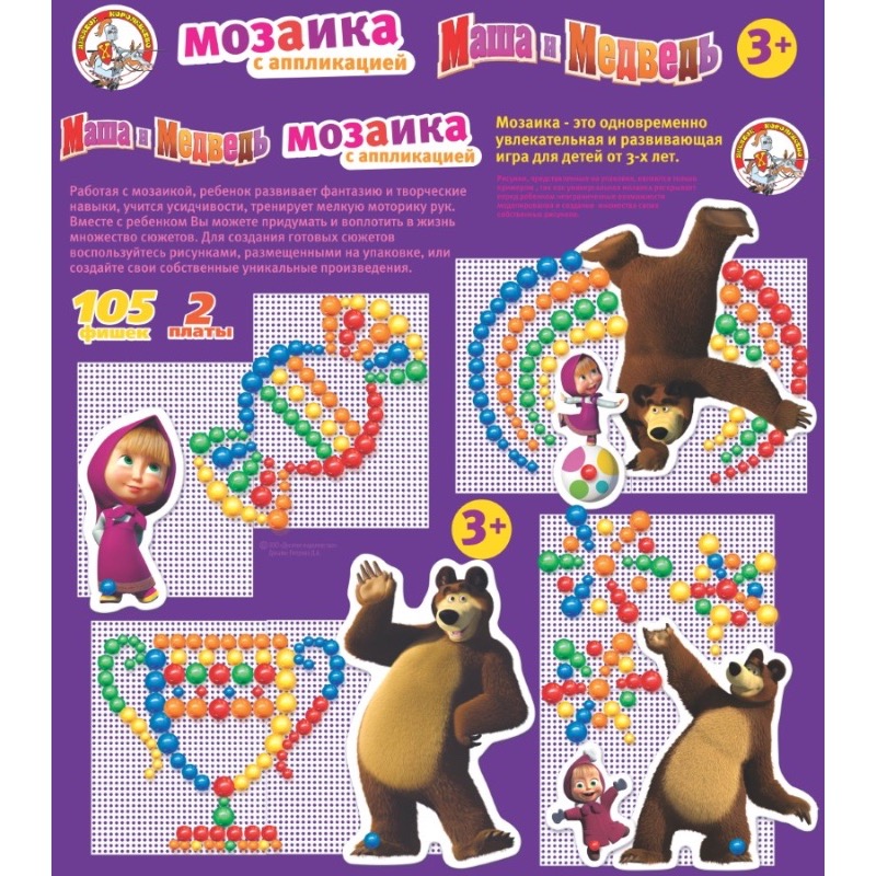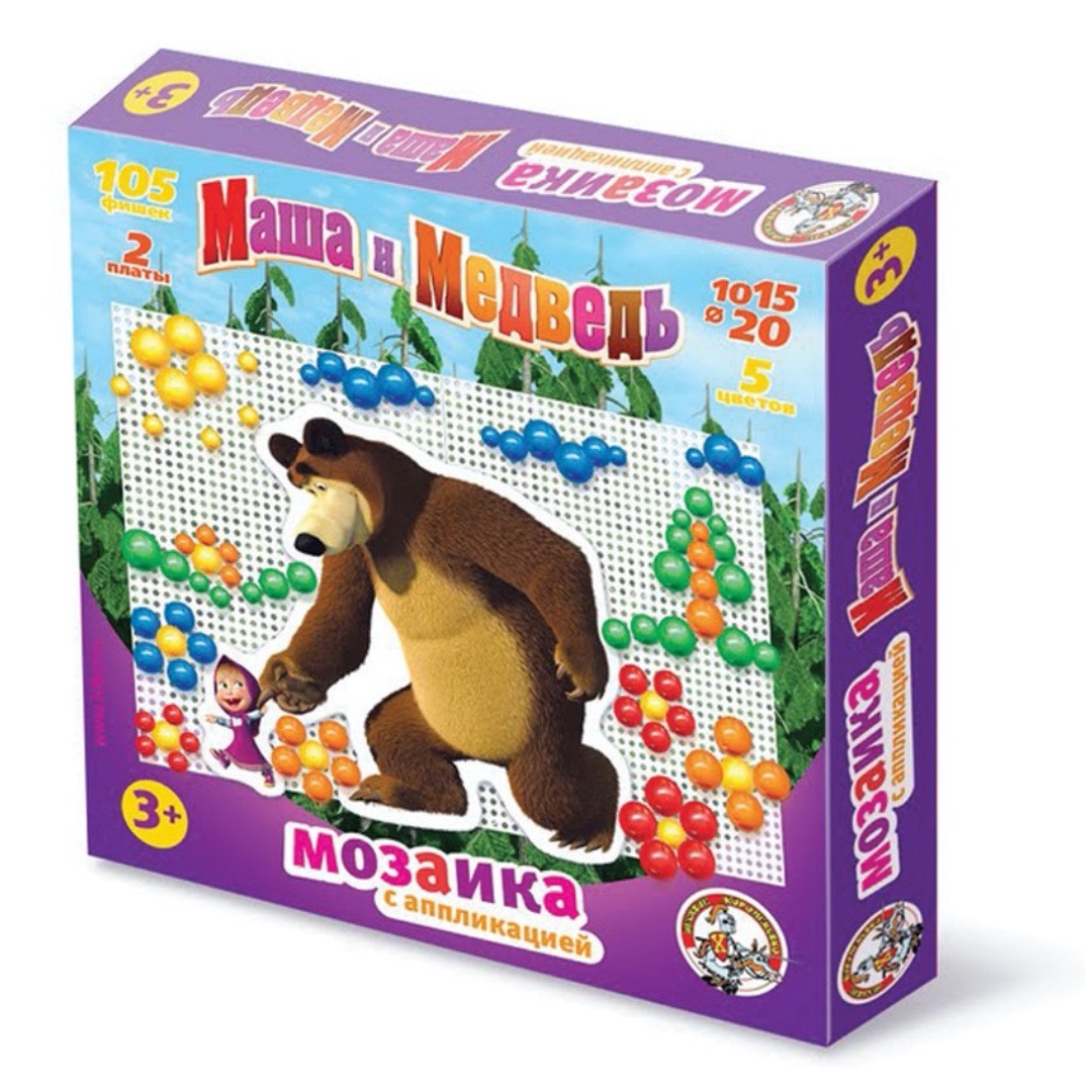 Артикул: 01420; Наименование: Мозаика с аппликациями "Маша и Медведь" d10, d15,d 20/105 эл; Штрихкод EAN-13: 4606088014203; Штрихкод EAN-14: 14606088014200; Количество штук в коробке: 11; Длина товара (см): 28,5; Ширина товара (см): 28,1; Пол: мальчики и девочки; Возраст: от 3-х лет до 5 лет; Вес нетто, кг: 0,4; Сертификат: RU C-RU. ЛТ47.B.04263 №0629877; срок действия: 29.05.2021; Описание товаров: Окунуться в мир необыкновенного творчества - составления мозаики из фишек различных цветов и диаметра, можно с любимыми героями мультсериала - неугомонной Машей и ее другом Медведем. Игра отлично тренирует мелкую моторику пальчиков, развивает фантазию и воображение. Для начала можно собирать рисунки по примерам на упаковке, а затем и по своему усмотрению составлять множество различных сюжетов.