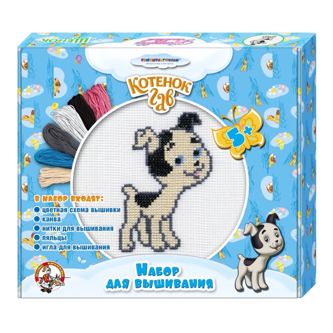 Забавный персонаж Щенок из мультфильма «Котенок по имени Гав» несомненно привлечет внимание Вашего ребенка и может пробудить желание освоить вышивку крестиком. А для этого в наборе уже есть все необходимое: цветная схема вышивки, канва, пяльцы, нитки для вышивания (мулине), игла для вышивания с закругленным кончиком, чтобы ребенок не укололся, плотность канвы без проблем позволяет вышивать с помощью такой иглы.