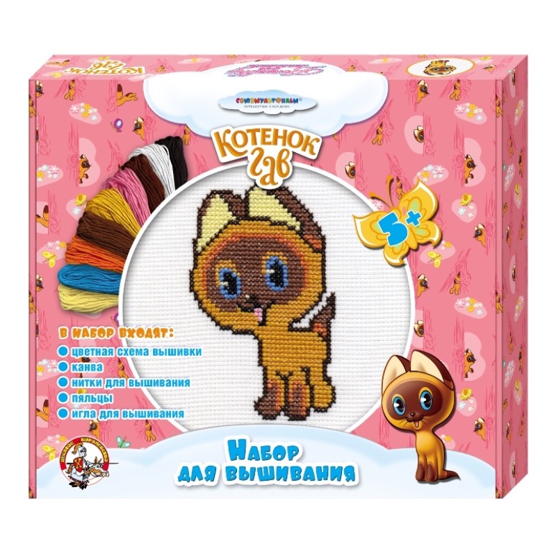 Милый персонаж «Котенок по имени Гав» из одноименного мультика несомненно привлечет внимание вашего ребенка и может пробудить желание освоить вышивку крестиком. А для этого в наборе уже есть все необходимое: цветная схема вышивки, канва, пяльцы, нитки для вышивания (мулине), игла для вышивания с закругленным кончиком, чтобы ребенок не укололся, плотность канвы без проблем позволяет вышивать с помощью такой иглы.