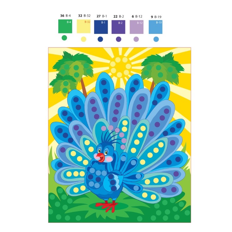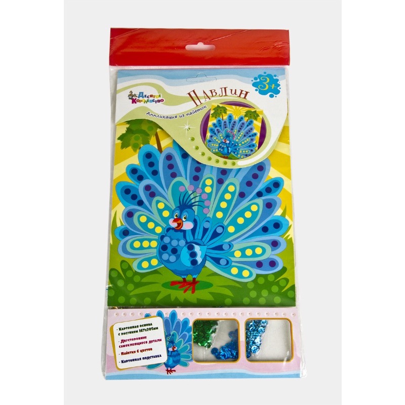 В составе безопасные для детей материалы: картон с изображением Павлина и стикеры, с вырезанными паетками разных цветов. Аккуратно выдавив паетку, нужно приклеить ее на, соответствующий цвету, круг на картинке. Рекомендовано к использованию родителей с детьми от 3-х лет.