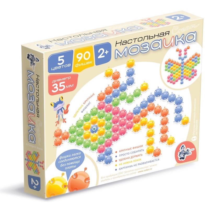 Артикул: 01538; Наименование: Мозаика настольная с крупными фишками d35/90эл (пастель); Штрихкод EAN-13: 4606088015385; Штрихкод EAN-14: 14606088015382; Количество штук в коробке: 9; Длина товара (см): 23,5; Ширина товара (см): 20,4; Пол: мальчики и девочки; Возраст: от 3-х лет до 5 лет; Вес нетто, кг: 0,29; Сертификат: RU C-RU. ЛТ47.B.04262 №0629876; срок действия: 29.05.2021; Описание товаров: Это самая необычная пластмассовая мозаика, для нее не требуется специального поля, достаточно ровной поверхности на полу или столе. 90 фишек пяти нежных кремовых цветов имеют размер 35 миллиметров, между собой они соединяются при помощи специальных замочков, которые позволяют не развалиться собранной мозаики даже при переноске. Специальная форма фишек позволяет складывать их стопкой, что очень удобно при хранении.