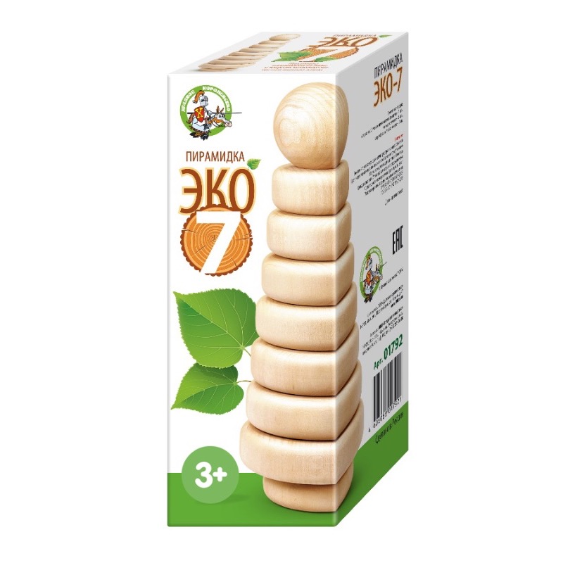 Артикул: 01792; Наименование: Пирамидка деревянная "Эко 7"; Штрихкод EAN-13: 4606088017921; Штрихкод EAN-14: 14606088017928; Количество штук в коробке: 20; Длина товара (см): 7,3; Ширина товара (см): 6,8; Пол: мальчики и девочки; Возраст: от 3 лет; Вес нетто, кг: 0,221; Сертификат: RU C-RU. ЛТ47.B.04259 №0629873; срок действия: 29.05.2021; Описание товаров: Любая пирамидка - прежде всего простейший логический конструктор, с которым впервые приходится знакомиться малышу, в возрасте от 1 года. Пытаясь правильно собрать эту игрушку, ребенок развивает координацию движения рук, глазомер и интеллектуальные способности, а последовательное изменение размеров колечек пирамидки поможет освоить понятия «больше-меньше».