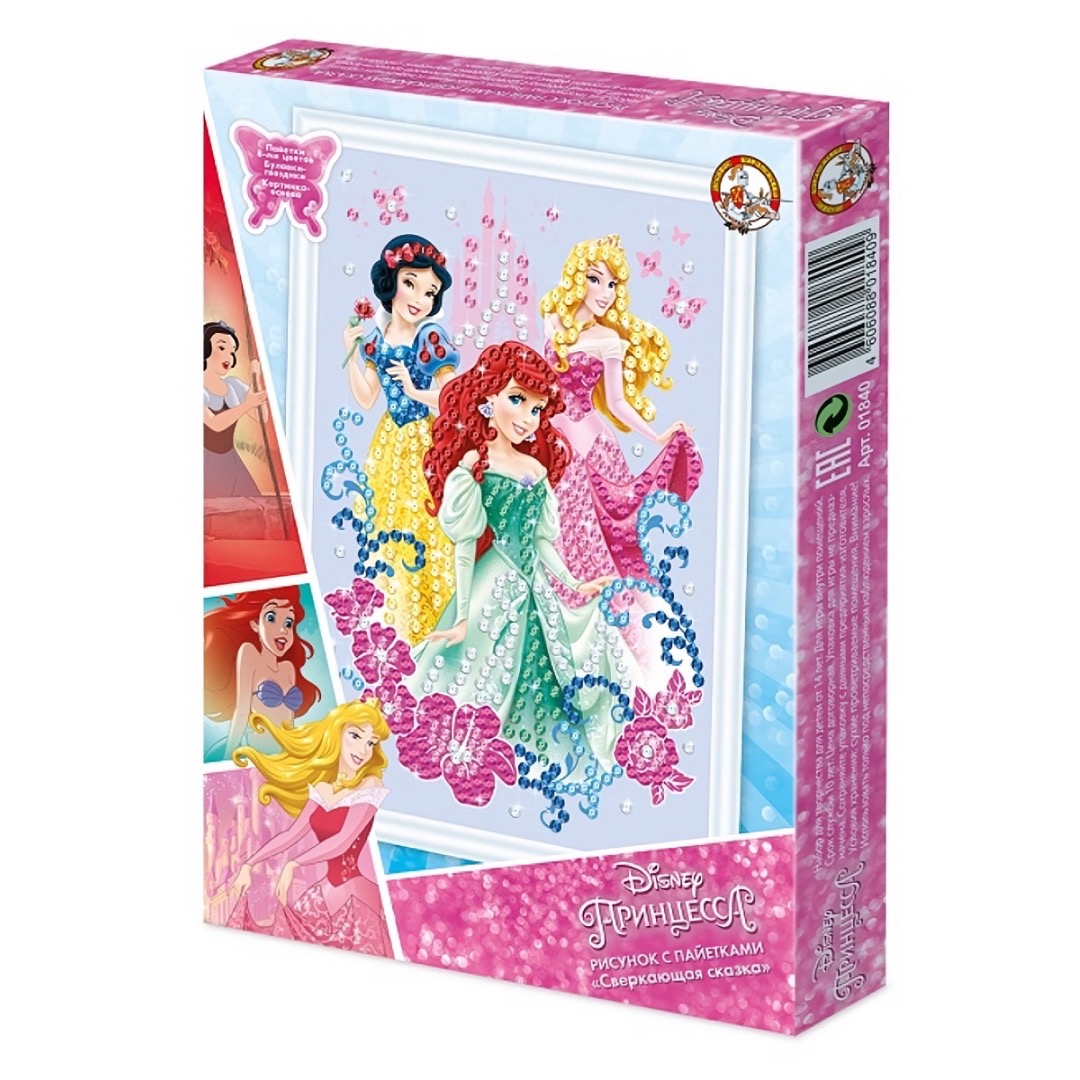 Артикул: 01840; Наименование: Набор для творчества. Рисунок с пайетками "Принцессы. Сверкающая сказка" (бол.) Дисней; Штрихкод EAN-13: 4606088018409; Штрихкод EAN-14: 14606088018406; Количество штук в коробке: 16; Длина товара (см): 37,5; Ширина товара (см): 28,3; Пол: девочки; Возраст: от 7 лет и старше; Вес нетто, кг: 0,295; Сертификат: отказное письмо №70; срок действия:; Описание товаров: Набор для творчества большой рисунок с пайетками «Сверкающая сказка» изготовлен по лицензии «Уолт Дисней» и рассчитан прежде всего на девочек, которые хотят и любят создавать своими руками красочные сверкающие шедевры для своих друзей и близких. Простая технология превратит их творчество в увлекательное время препровождения и поможет в игровой форме развить у ребенка творческие способности, внимание и усидчивость. Рисунок в рамке, украшенный пайетками, будет достойно смотреться в любом месте.