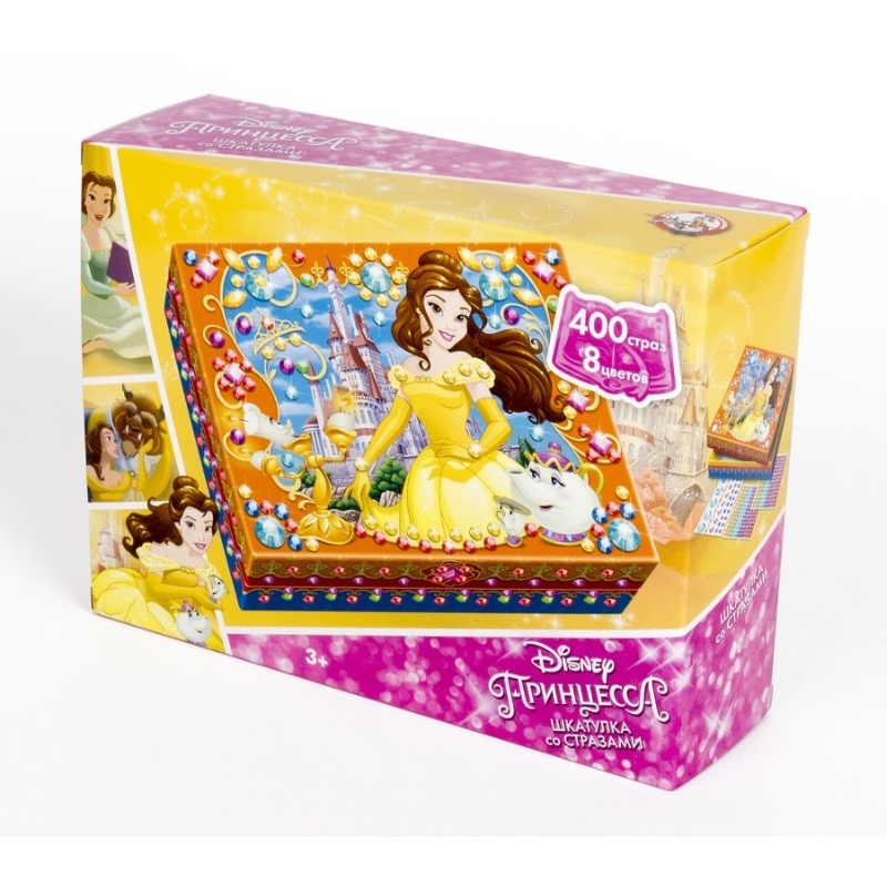 Набор для творчества большая шкатулка со стразами «Белль» – отличный способ для развития креативности у детей от 5 до 7 лет. Это будет идеальным развлечением для девочек. В комплект входит красочная шкатулка размером 20х15х6 см с изображением популярного диснеевского персонажа и набор страз 8 цветов, 400 штук разных размеров.
