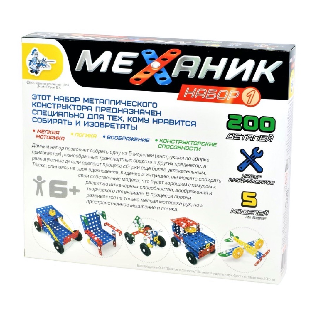 Металлический конструктор «Механик-1» рекомендуется детям старше 6 лет, способствует развитию логики воображения и конструкторских способностей.; Изготовитель: ООО "Десятое королевство Волга"; Страна происхождения: Россия; Материал: металл, пластмасса; Лицензия: ; Количество игроков: ;