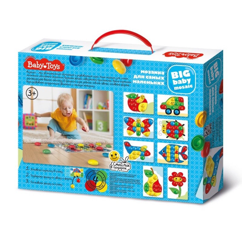 Артикул: 02520; Наименование: Мозаика для самых маленьких d40/4 цв/27 эл BABY TOYS; Штрихкод EAN-13: 4606088025209; Штрихкод EAN-14: 14606088025206; Количество штук в коробке: 12; Длина товара (см): 37; Ширина товара (см): 27,6; Пол: мальчики и девочки; Возраст: от 3-х лет до 5 лет; Вес нетто, кг: 0,531; Сертификат: RU C-RU. ЛТ47.B.04263 №0629877; срок действия: 29.05.2021; Описание товаров: Мозаика для самых маленьких 27 элементов от Baby Toys. Состав: плата на 28 фишек (348 х 233 мм), картинки двухсторонние – 4 шт. (345 х 230 мм), фишки 4 цветов (размер – 4 см, 3 вида форм: круглая, треугольная, квадратная) – 24 шт., глазки (4 см) – 2 шт., смайлик (4 см) – 1 шт. Материал: пластмасса. Можно собрать 8 картинок: яблоко, машина, бабочка, божья коровка, самолёт, рыбка, груша, цветок. Развивает мелкую моторику рук и логическое мышление, учит отличать оттенки цветов и размеры объектов.; Изготовитель: ООО "Десятое королевство"; Страна происхождения: Россия; Материал: пластмасса, бумага; Лицензия: ; Количество игроков: ;