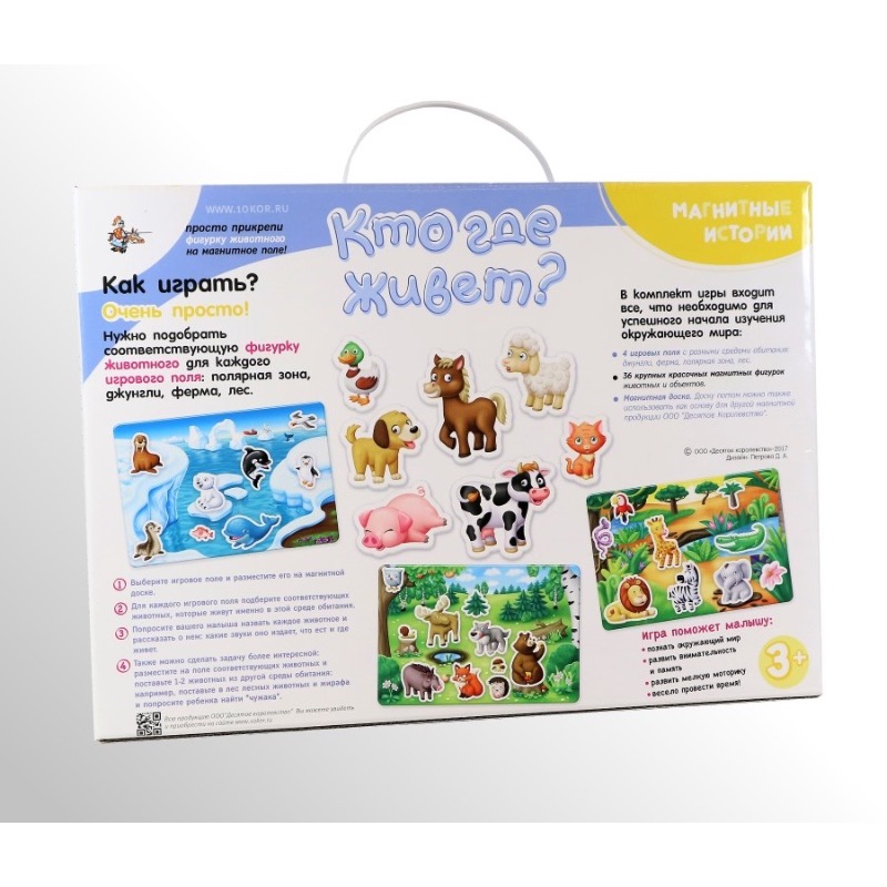 Артикул: 02652; Наименование: Магнитные истории "Кто где живет?"; Штрихкод EAN-13: 4606088026527; Штрихкод EAN-14: 14606088026524; Количество штук в коробке: 12; Длина товара (см): 36,4; Ширина товара (см): 26,4; Пол: мальчики и девочки; Возраст: от 3 лет до 5 лет; Вес нетто, кг: 0,49; Сертификат: RU C-RU. ЛТ47.B.04263 №0629877; срок действия: 29.05.2021; Описание товаров: Увлекательная обучающая игра для Вашего ребенка, начиная с трёх летнего возраста.
