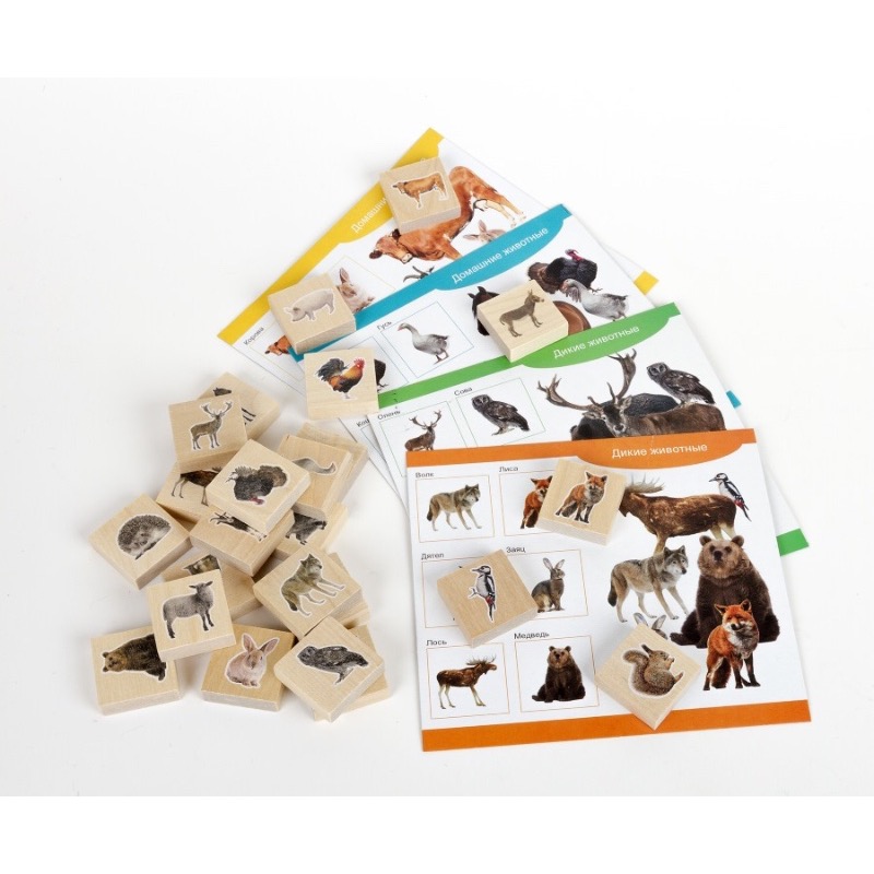 - 4 картонные карточки (16х14,5 см) с тематическим картинками домашних и диких животных;