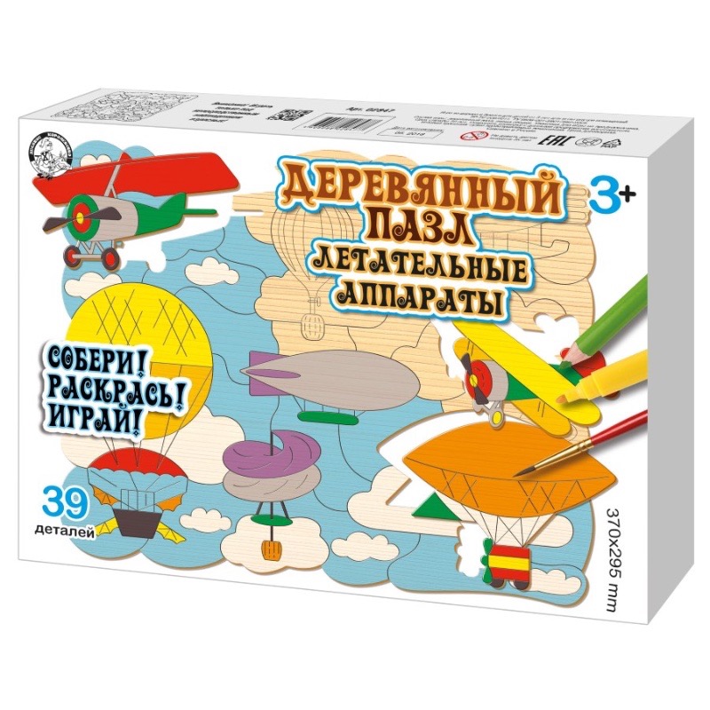 Артикул: 02847; Наименование: Пазл деревянный "Летательные аппараты" (37х29,5см) 39 эл (Собери! Раскрась! Играй!); Штрихкод EAN-13: 4606088028477; Штрихкод EAN-14: 14606088028474; Количество штук в коробке: 8; Длина товара (см): 28,5; Ширина товара (см): 19,6; Пол: мальчики и девочки; Возраст: от 3-х лет; Вес нетто, кг: 0,309; Сертификат: RU C-RU. ЛТ47.B.04259 №0629873; срок действия: 29.05.2021; Описание товаров: Деревянный пазл «Летательные аппараты» входит в серию деревянных пазлов для малышей «Собери! Раскрась! Играй!».