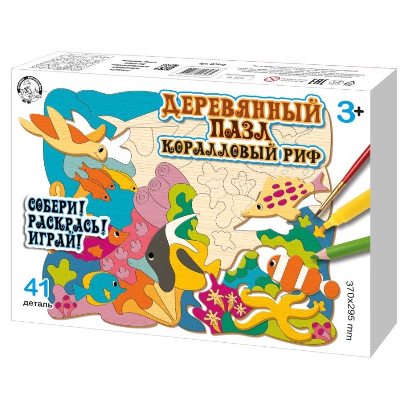 Артикул: 02848; Наименование: Пазл деревянный "Коралловый риф" (37х29,5см) 41 эл (Собери! Раскрась! Играй!); Штрихкод EAN-13: 4606088028484; Штрихкод EAN-14: 14606088028481; Количество штук в коробке: 8; Длина товара (см): 28,5; Ширина товара (см): 19,6; Пол: мальчики и девочки; Возраст: от 3-х лет; Вес нетто, кг: 0,313; Сертификат: RU C-RU. ЛТ47.B.04259 №0629873; срок действия: 29.05.2021; Описание товаров: Деревянный пазл «Коралловый риф» входит в серию деревянных пазлов для малышей «Собери! Раскрась! Играй!».