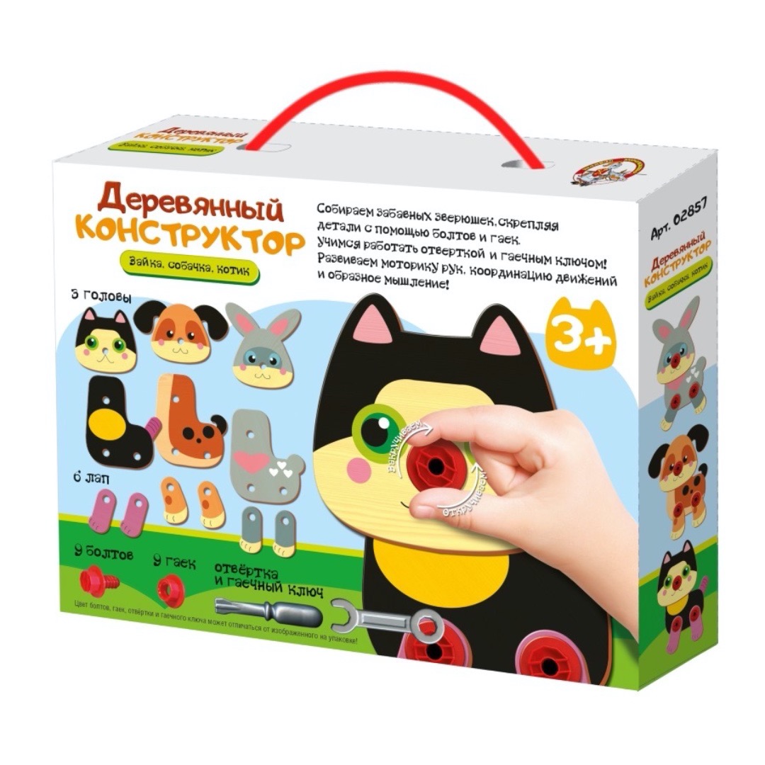 Артикул: 02857; Наименование: Конструктор деревянный "Зайка, собачка, котик"; Штрихкод EAN-13: 4606088028576; Штрихкод EAN-14: 14606088028573; Количество штук в коробке: 14; Длина товара (см): 23,5; Ширина товара (см): 17,9; Пол: мальчики и девочки; Возраст: от 3-х лет; Вес нетто, кг: 0,405; Сертификат: RU C-RU. ЛТ47.B.04260 №0629874; срок действия: 29.05.2021; Описание товаров: Собираем забавных зверюшек, скрепляя детали с помощью болтов и гаек. Учимся работать отверткой и гаечным ключом!