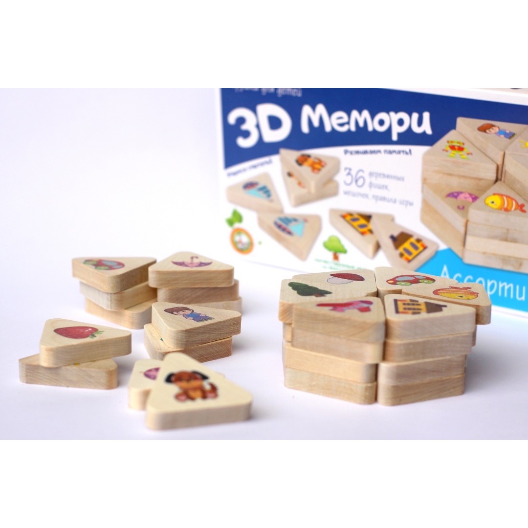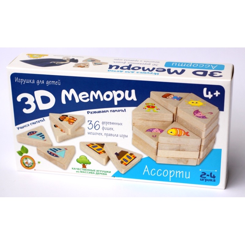 Артикул: 02906; Наименование: Игра 3D Мемори "Ассорти"; Штрихкод EAN-13: 4606088029061; Штрихкод EAN-14: 14606088029068; Количество штук в коробке: 8; Длина товара (см): 24,5; Ширина товара (см): 13,1; Пол: мальчики и девочки; Возраст: от 4-х лет; Вес нетто, кг: 0,395; Сертификат: RU C-RU. ЛТ47.B.04260 №0629874; срок действия: 29.05.2021; Описание товаров: Если вы ищете игру, в которую будет полезно играть детям и интересно играть всей семьей, то вы ее нашли!