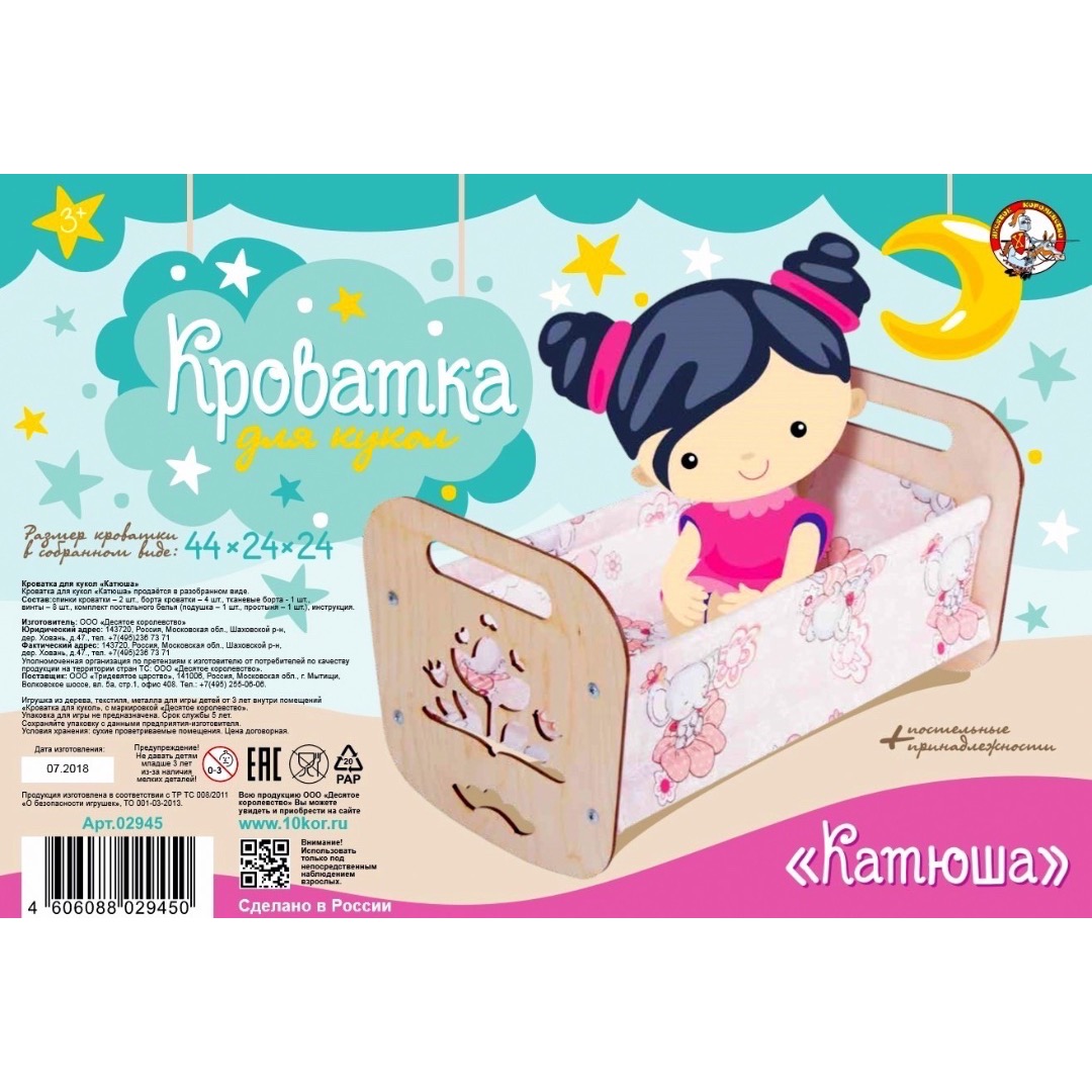 В интернет магазине «Десятое королевство» Вы можете купить деревянную кроватку «Катюша», как и другие наборы мебели для кукол , по привлекательной цене с доставкой по России. При этом мы всегда предоставляем гарантированные скидки даже при покупке от одной тысячи рублей.; Изготовитель: ООО "Десятое королевство"; Страна происхождения: Россия; Материал: дерево, текстильный материал, металл; Лицензия: ; Количество игроков: ;