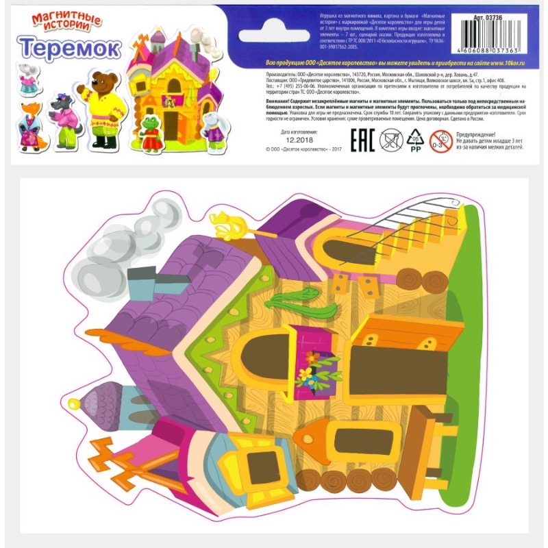 Артикул: 03736; Наименование: Магниты "Теремок". Серия Магнитные истории (европодвес, 6х10шт); Штрихкод EAN-13: 4606088037363; Штрихкод EAN-14: 14606088037360; Количество штук в коробке: 60; Длина товара (см): 24; Ширина товара (см): 22,9; Пол: мальчики и девочки; Возраст: от 5 лет до 7 лет; Вес нетто, кг: 0,125; Сертификат: RU C-RU. ЛТ47.B.04263 №0629877; срок действия: 29.05.2021; Описание товаров: Набор магнитов «Теремок» входит в серию игр «Магнитные истории» . Устройте домашнее представление на магнитной доске или прямо на холодильнике!