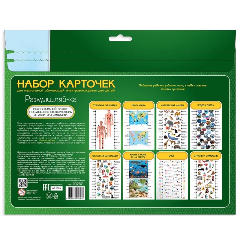 Артикул: 03787; Наименование: Набор карточек к Электровикторинам: "Размышляй-ка"; Штрихкод EAN-13: 4606088037875; Штрихкод EAN-14: 14606088037872; Количество штук в коробке: 50; Длина товара (см): 31,5; Ширина товара (см): 0,3; Пол: мальчики и девочки; Возраст: от 7 лет; Вес нетто, кг: 0,116; Сертификат: RU C-RU. ЛТ47.B.04240 №0629857; срок действия: 15.04.2021; Описание товаров: Подарите ребенку радость игры, а себе – счастье делать приятное! Дополните настольную обучающую игру серии «Электровикторины» новыми игровыми карточками!