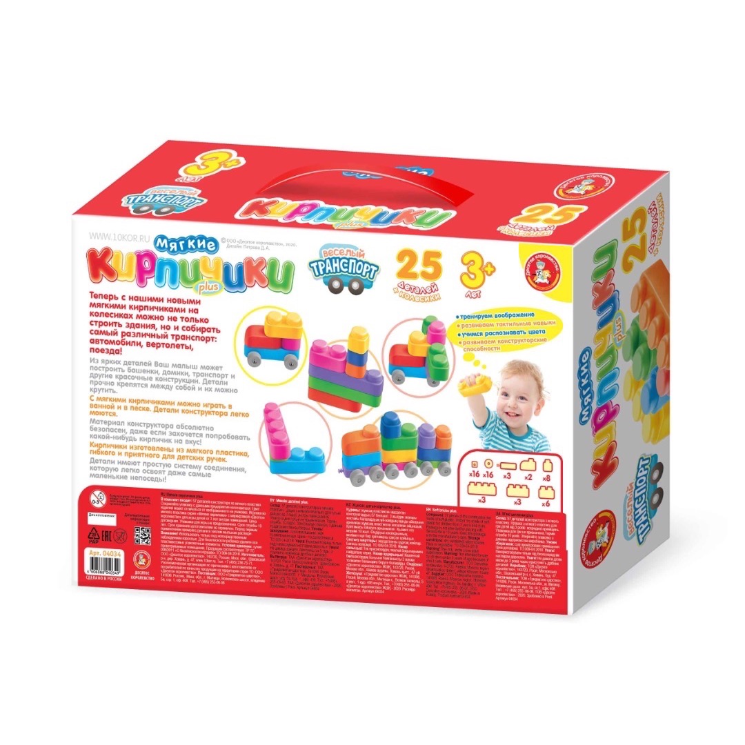 Артикул: 04034; Наименование: Конструктор "Мягкие кирпичики plus. Веселый транспорт" 25 дет+колесики; Штрихкод EAN-13: 4606088040349; Штрихкод EAN-14: 14606088040346; Количество штук в коробке: 7; Длина товара (см): 32; Ширина товара (см): 22; Пол: мальчики и девочки; Возраст: от 3 лет; Вес нетто, кг: 0,85; Сертификат: RU C-RU. АД88.B.00242/20 №0205464; срок действия: 14.01.2023; Описание товаров: ; Изготовитель: ООО "Десятое королевство"; Страна происхождения: ; Материал: полимерный материал; Лицензия: ; Количество игроков: ;