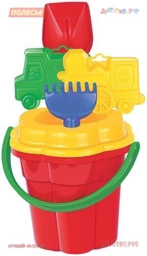 Ведро-цветок большое, ситечко-цветок большое, лопатка №5, грабельки №5, формочки (самосвал + паровоз)