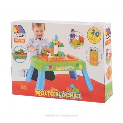 Он имеет форму столика, который трансформируется, благодаря наличию складных ножек. Панель стола имеет место, куда можно сложить все элементы конструктора, что обеспечивает удобство хранения и перемещения игрового набора. На верхней панели закреплены держатели для конструктора. Это позволяет строить прямо на столе, поэтому конструкция получается очень устойчивой. Набор дополнен механизмом, движение которого позволяет рассмотреть творение малыша со всех сторон. У ребёнка появляется отдельная зона для игр с конструктором. Набор выполнен в зелёном цвете.