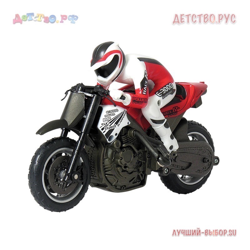 Комплект: мотоцикл с гонщиком, пульт д/у, набор запасных шин, инструкция.