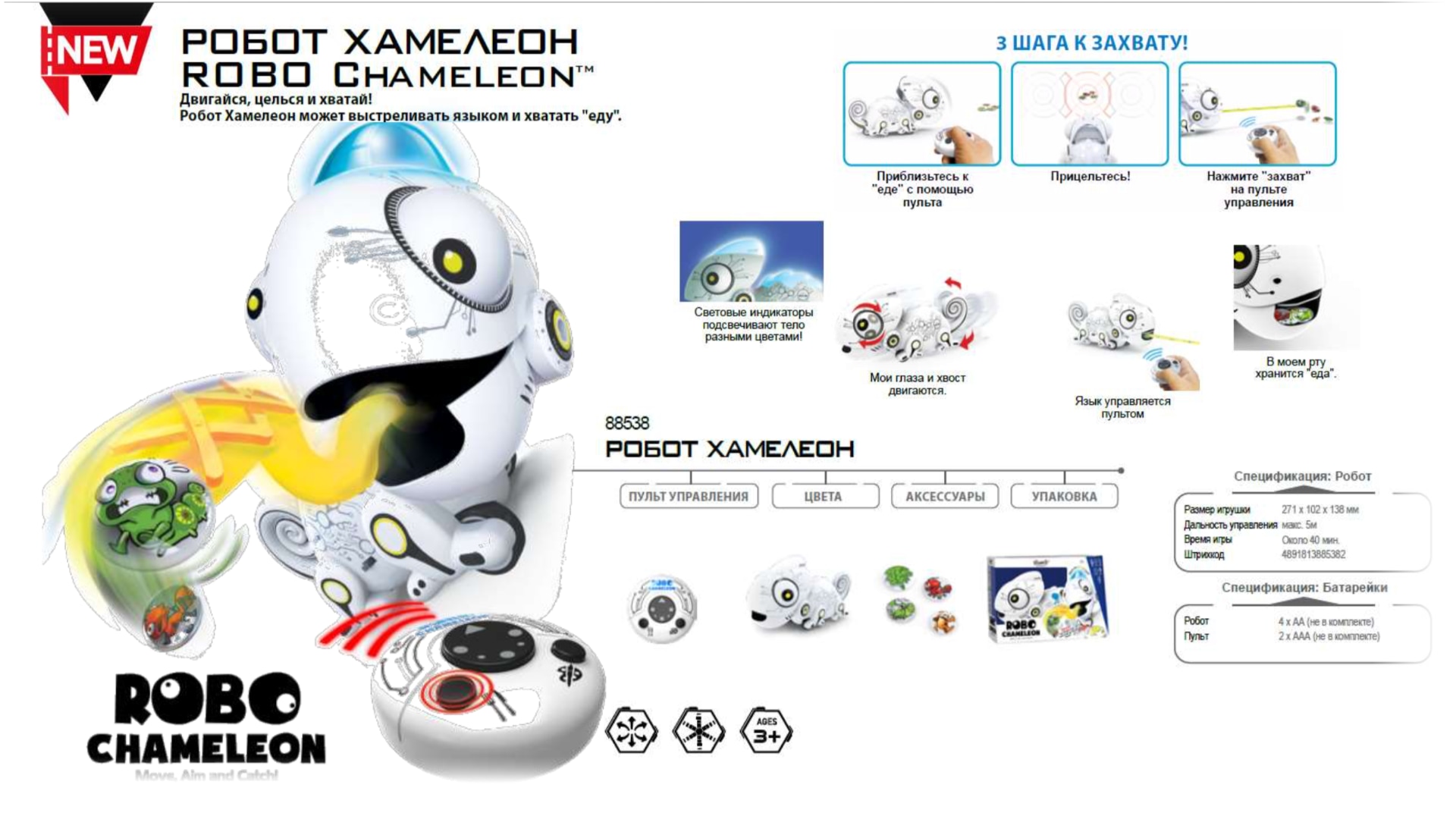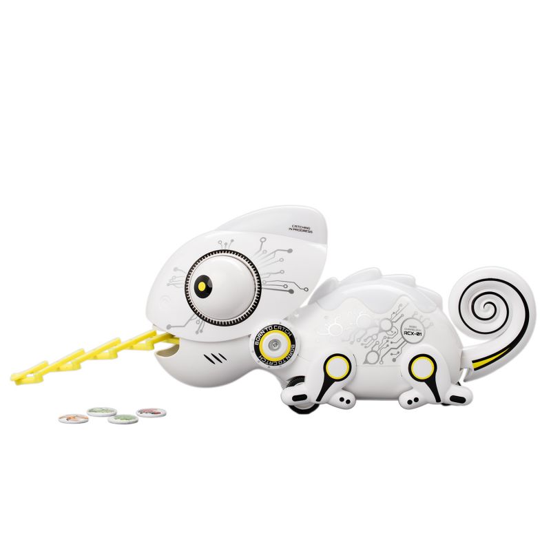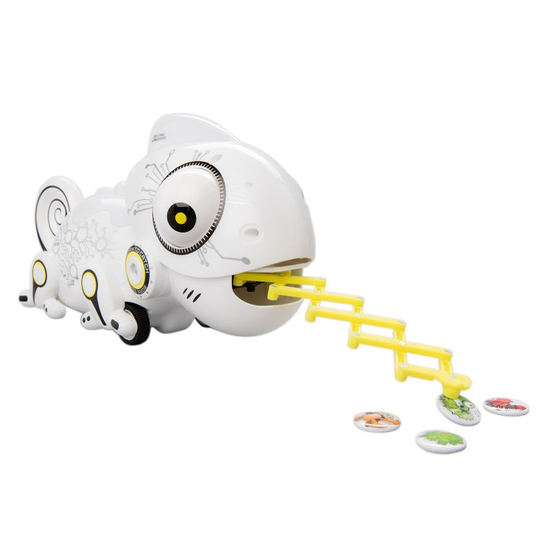 Робот Хамелеон – отличный сюрприз для маленького ребенка. Необычная игрушка, внешне похожая на настоящую ящерицу, наделена основными ее качествами – меняет цвет, молниеносно выбрасывает язык, ловя добычу, вращает глазами на 360⁰.