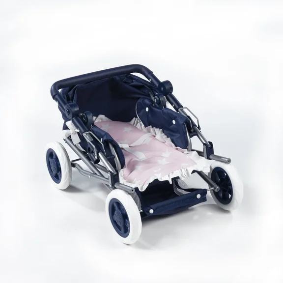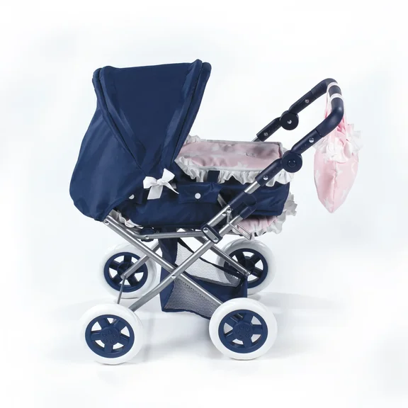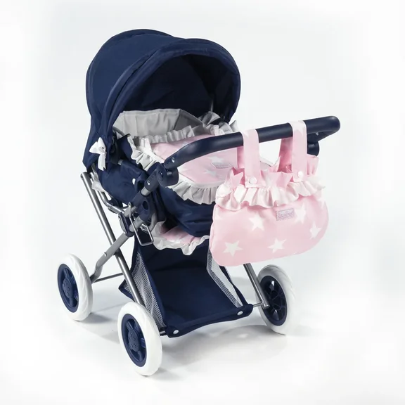 Коляска выполнена в темно-синем цвете с розовыми аксессуарами, с принтом "звездочки".