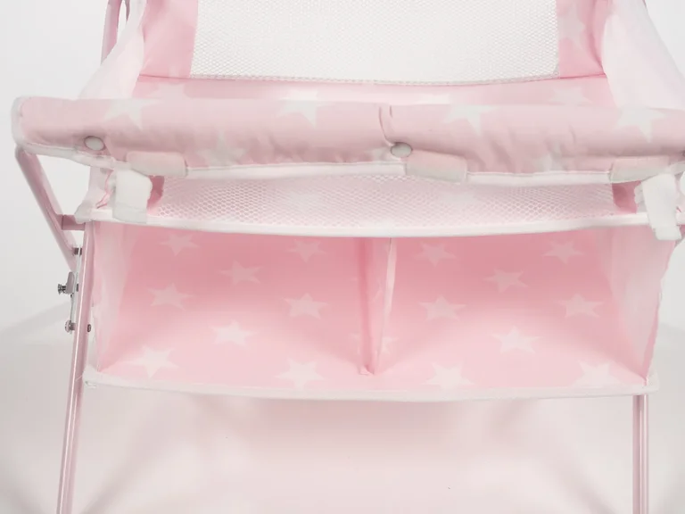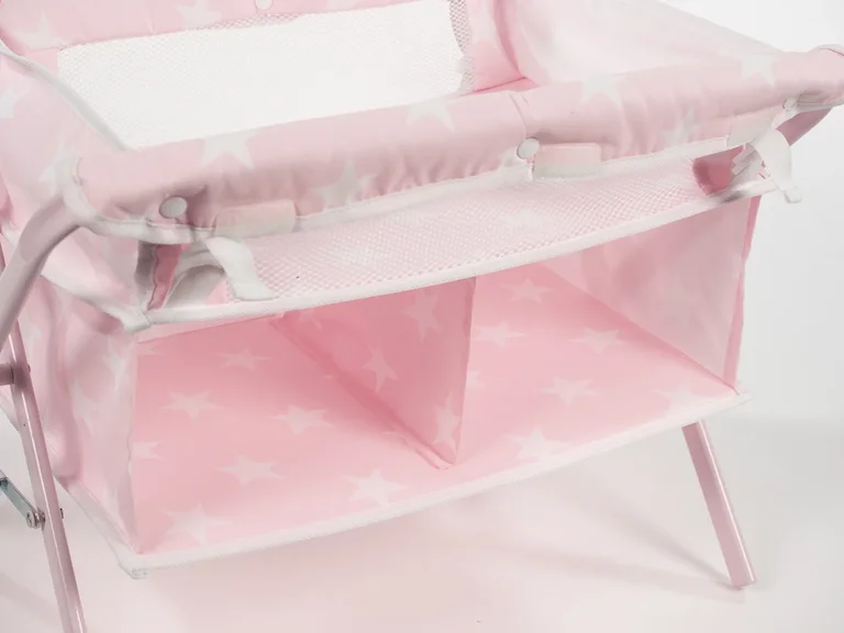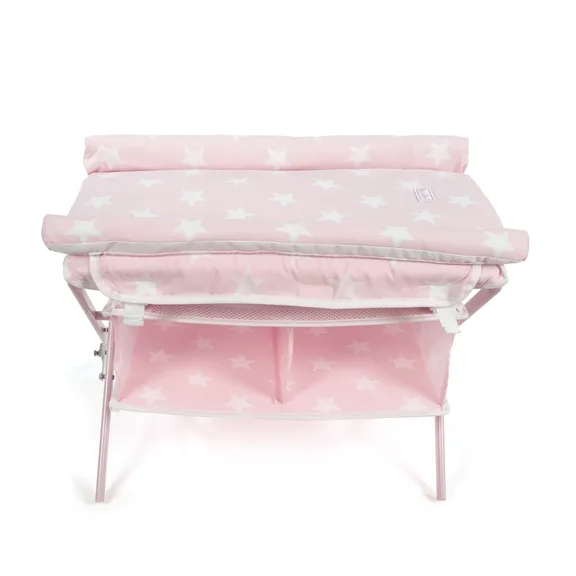 Пеленальный столик для куклы из серии "Карлота" розового цвета с белыми звездочками. Оборудован специальными полочками для аксессуаров. Легко складывается.